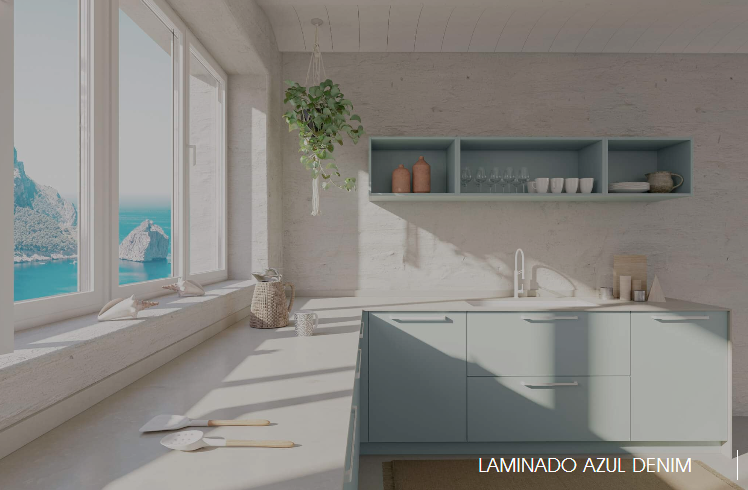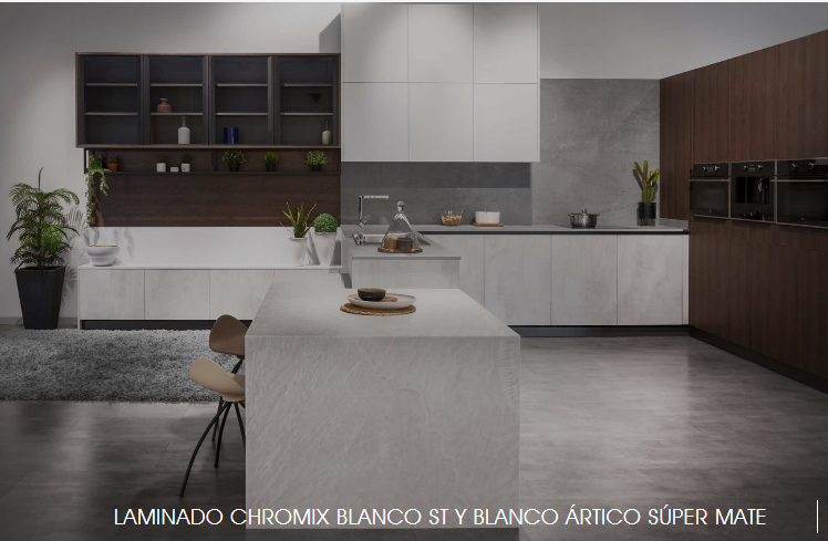 El laminado melamínico nos permite limpiar fácilmente nuestras cocinas y no tener problemas de rayado ya que se trata de un material muy resistente. Podemos encontrar diferentes acabados, colores y texturas.