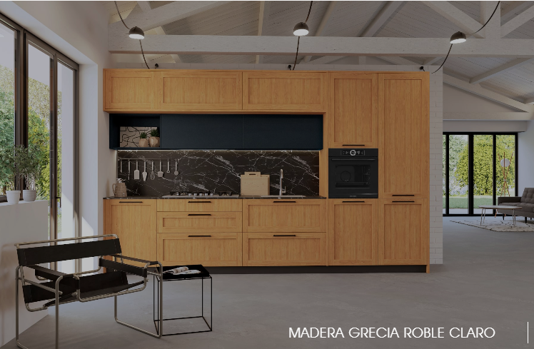 La variedad de colores y tonos madera genera una gran sensación de confort y calidez en la cocina, creando un espacio acogedor y atractivo.La puerta Grecia está formada por barras de madera maciza de roble rechapada y panel de aglomerado rechapado. Con barniz al agua.La puerta Croacia es lisa, sin molduras y está fabricada en tablero de partículas de madera (aglomerado) recubierto de chapa de madera. Los cantos son macizos de 1 cms de madera por 3 lados y 6 cms de uñero.
